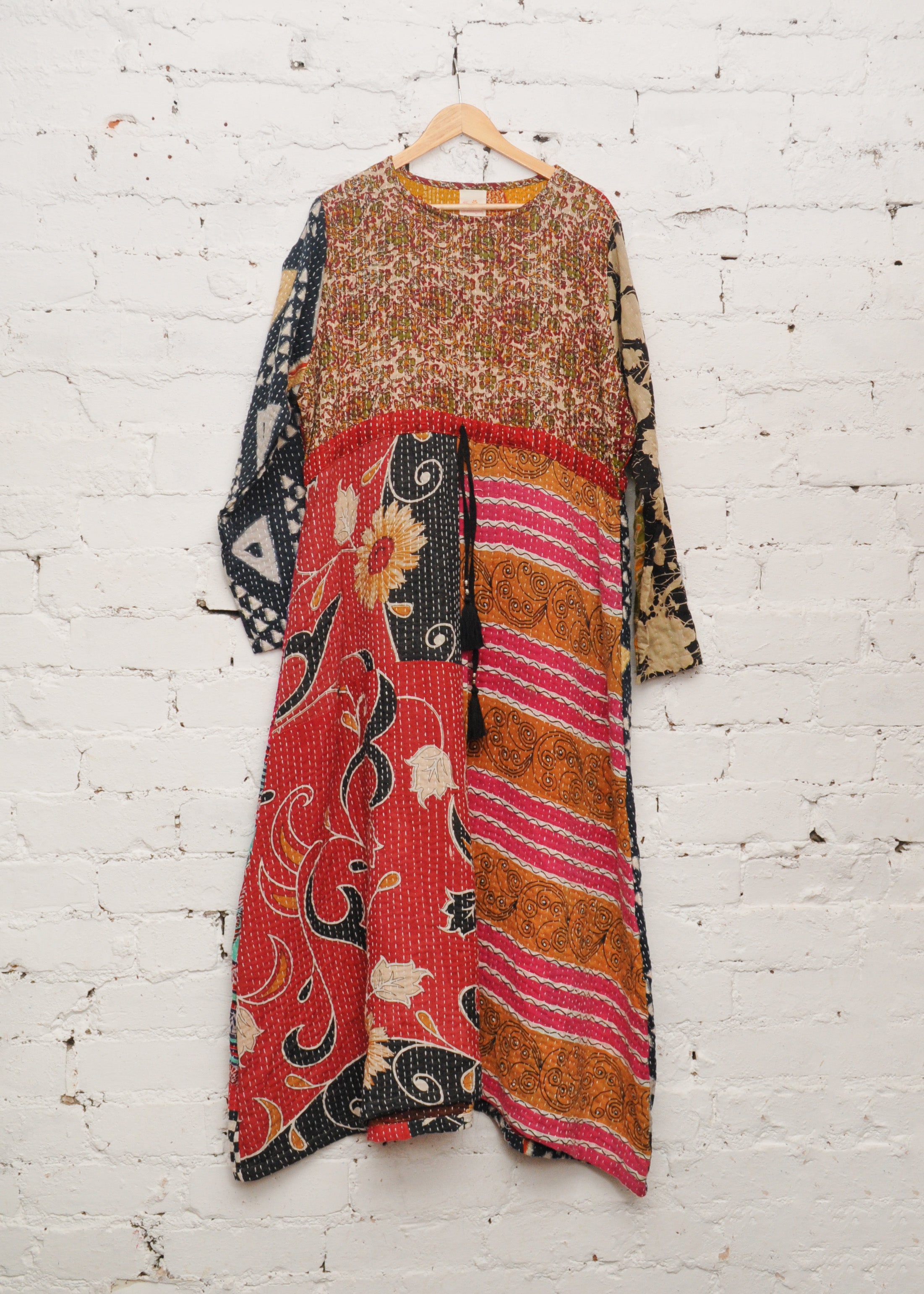 Bright, bold and handcrafted from 100% reclaimed vintage cotton sari fabric our collection channels the free spirit of the seventies with flowing robe dresses, wide-leg pants and arty tunics. Each piece of clothing in this range is unique, bold and stitched by female artisans before being reworked into seventies inspired designs.